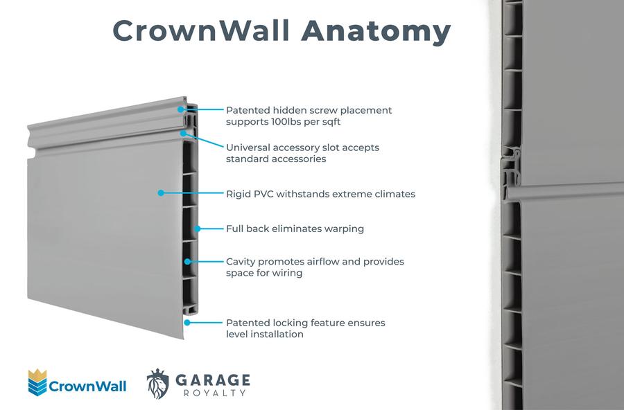 Crownwall is the core of our organizational system. Cut the clutter with the strongest and most stylish slatwall on the market! Reclaim valuable square footage by maximizing usable wall space to fit your unique needs. Our modular design means no space is too great or too small. Cover your walls, install a simple section, or even break it into several tracks. Our panels can be easily cut to any desired length. Change your configuration or add to it at any time.